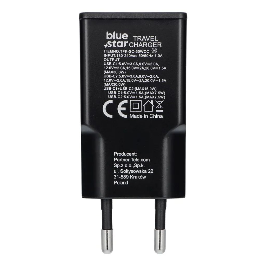 Nabíjecí adaptér úzký 2 x USB C QC4.0 PD 3A 30W černý - Blue Star