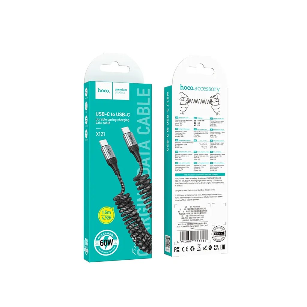 Rychlonabíjecí kabel Hoco X121 s konektorem USB-C na USB-C, délka 1,5 metru. Umožňuje rychlé nabíjení a přenos dat. Podporuje protokoly Power Delivery a Quick Charge 3.0.