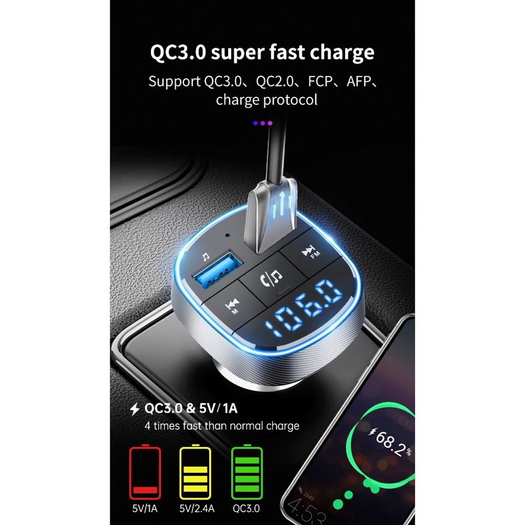 Vysílač do auta BC57 s portem USB pro rychlé nabíjení, technologií Bluetooth a hlasovým asistentem. Díky přenosu FM můžete poslouchat rádio během jízdy a vestavěný mikrofon umožňuje telefonovat handsfree. Podporuje paměťové karty TF.