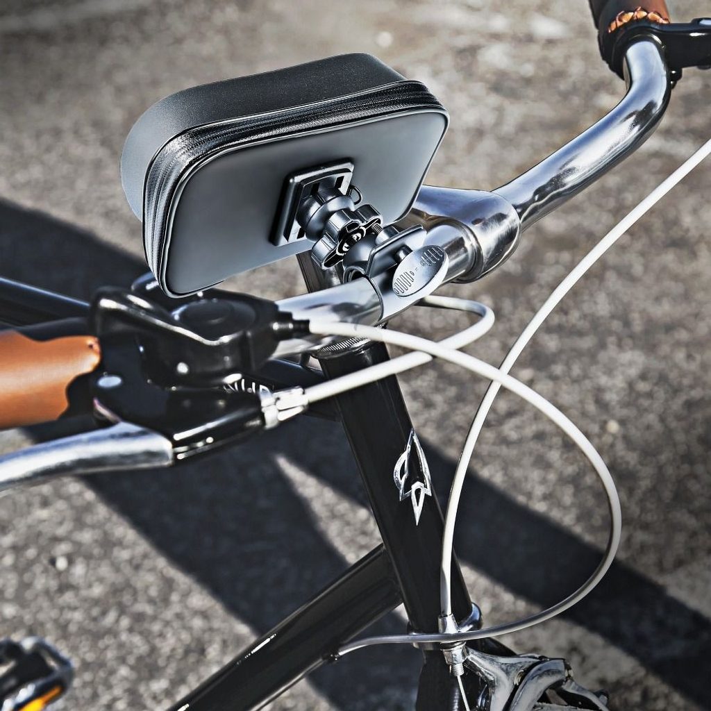 Držiak na bicykel s priehradkou. Zapína sa na zips. Zabezpečuje bezpečnosť používania smartfónu počas jazdy na bicykli. Upevňuje sa na rám bicykla. Vodotesný - umožňuje používať smartfón v náročných podmienkach, chráni zariadenie pred vlhkosťou a zaplavením. Upevňuje sa pomocou zipsu, čo uľahčuje rýchlu inštaláciu zariadenia do držiaka. Materiál odolný voči poškodeniu znižuje riziko poškodenia a poškriabania. Vybavené prepážkou na ochranu pred slnkom pre dobrú viditeľnosť obrazovky smartfónu.